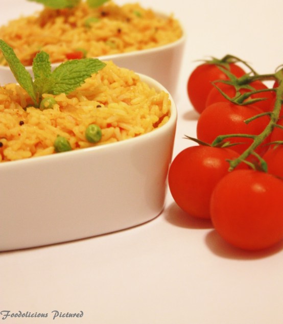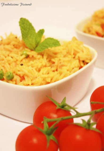 Now add ginger- garlic and fry for a minute or until the raw smell is no more. Once done add the green chilli, onion and fry till the onion turn light brown. Add the chopped tomato pieces, tomato paste, salt, chilli powder and turmeric. Once the tomatoes are cooked (takes about 3 minutes on medium heat) add the rice, peas and mix well to combine. Add hot water, cover and cook till the rice is completely cooked.
