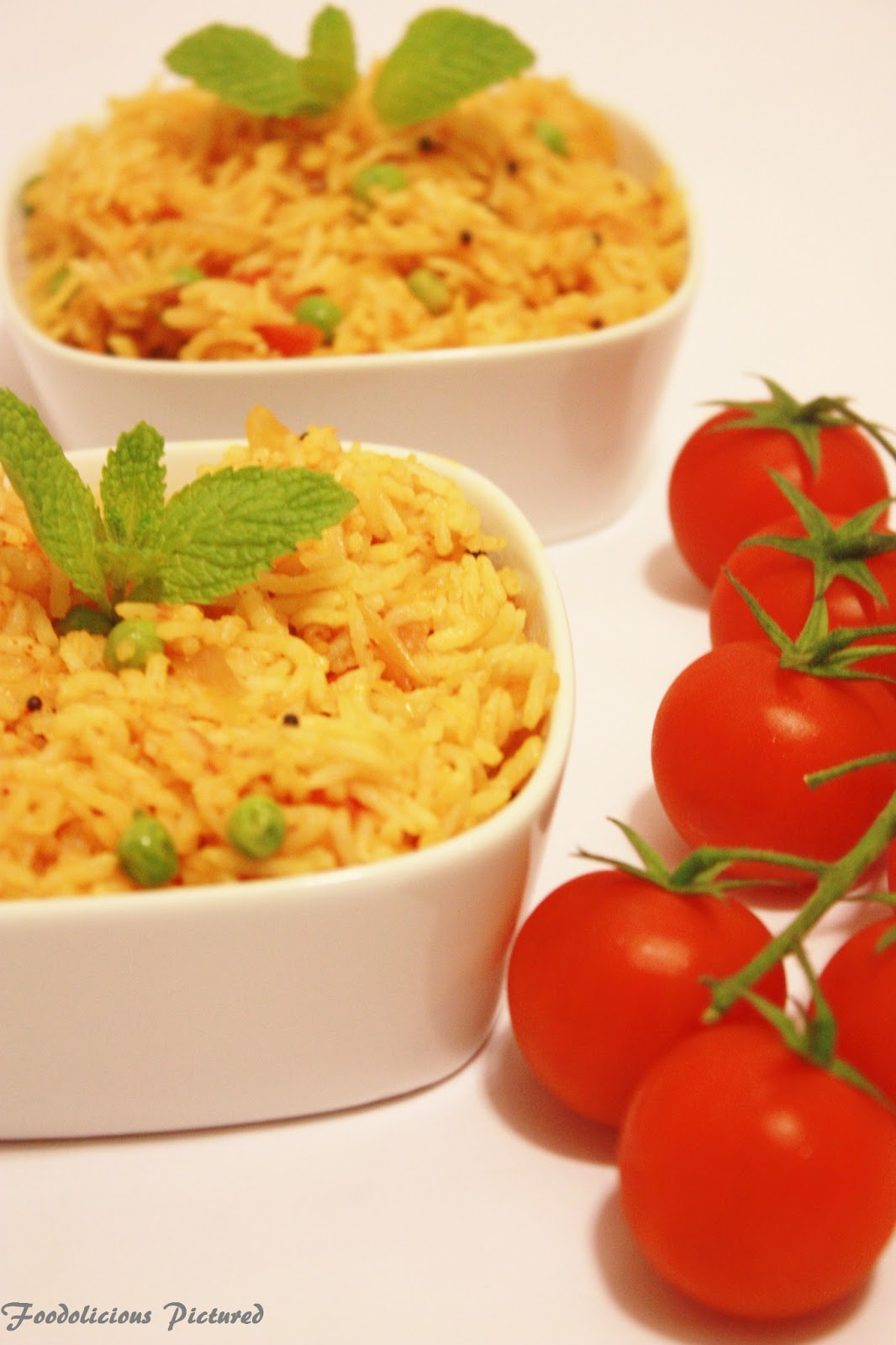 Now add ginger- garlic and fry for a minute or until the raw smell is no more. Once done add the green chilli, onion and fry till the onion turn light brown. Add the chopped tomato pieces, tomato paste, salt, chilli powder and turmeric. Once the tomatoes are cooked (takes about 3 minutes on medium heat) add the rice, peas and mix well to combine. Add hot water, cover and cook till the rice is completely cooked.