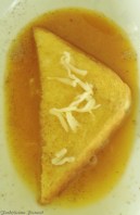 - Soak the bread slices . Sprinkle the grated cheese on one side and place the soaked bread with the cheese side down in the skillet.