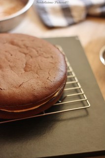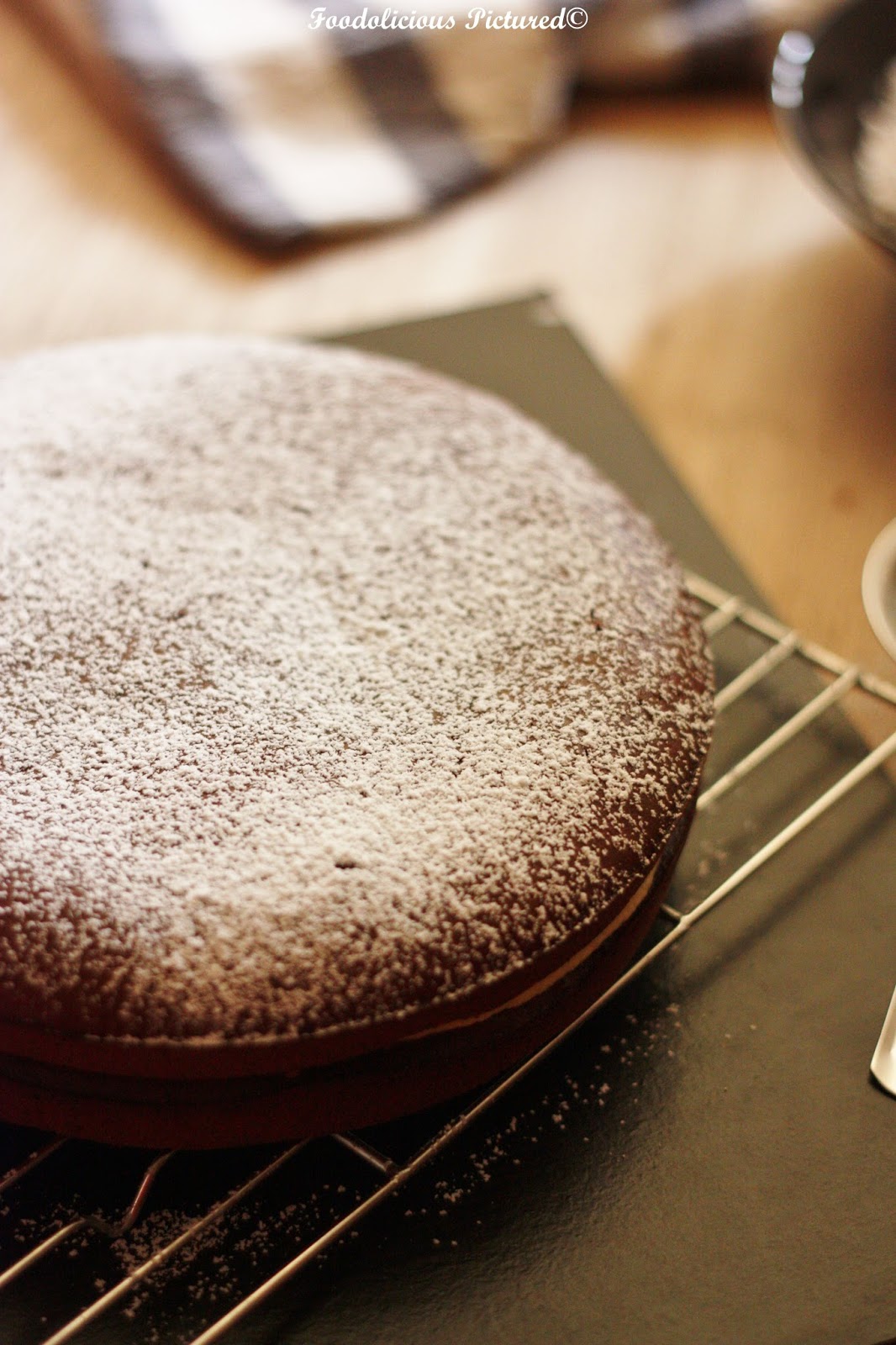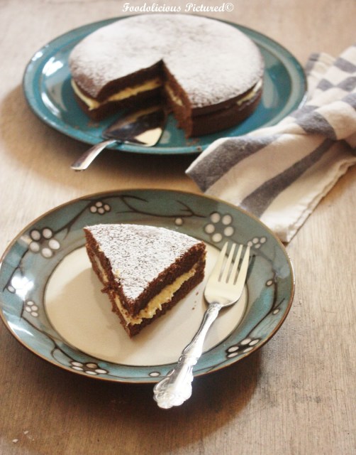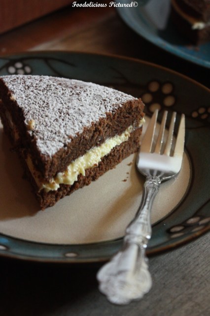 A slice of the cake was much a welcome for me in spite of not being a chocolate fan. I had some mango flavored butter cream sitting in the fridge which I used for the filling and dusted generously with icing sugar.