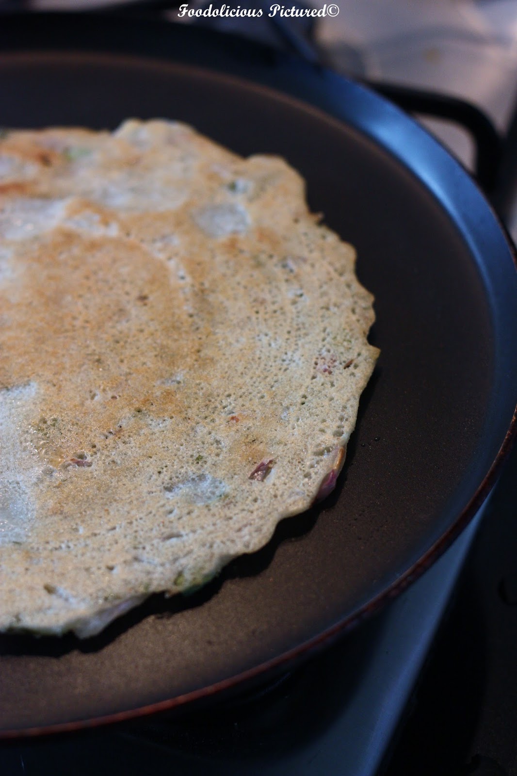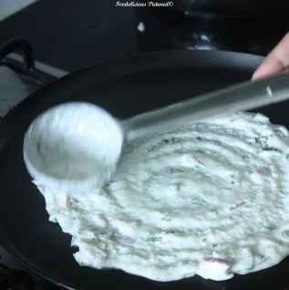 Heat the dosa griddle. Take I ladle of batter and spread into a circular motion (If you are not using a non-stick pan then add a teaspoon of oil and then spread the batter), Drizzle oil/ghee along the edges of the dosa, cover and cook till the base begins to brown.