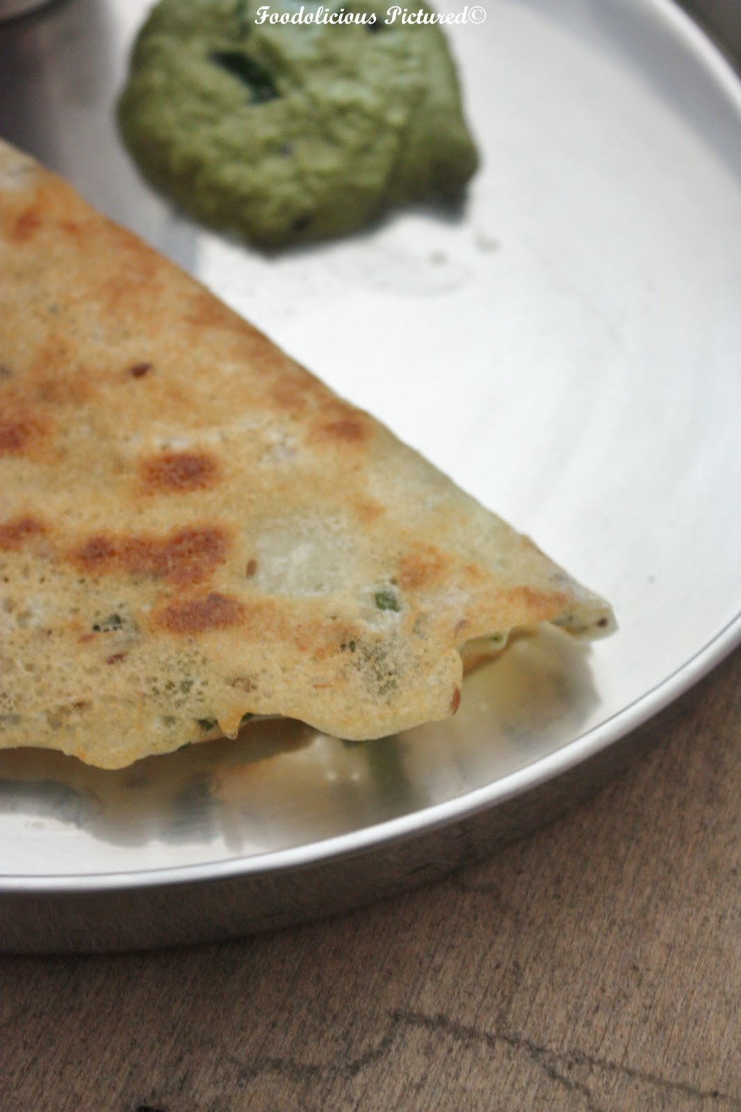 Uncover and flip the dosa over and cook briefly for a couple of seconds. Flip it back and fold it into half and remove the dosa from the pan.