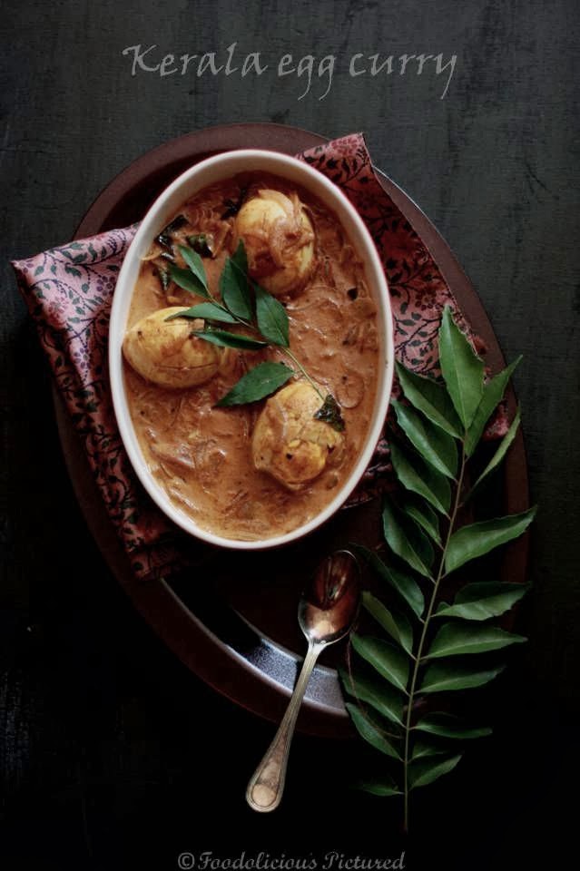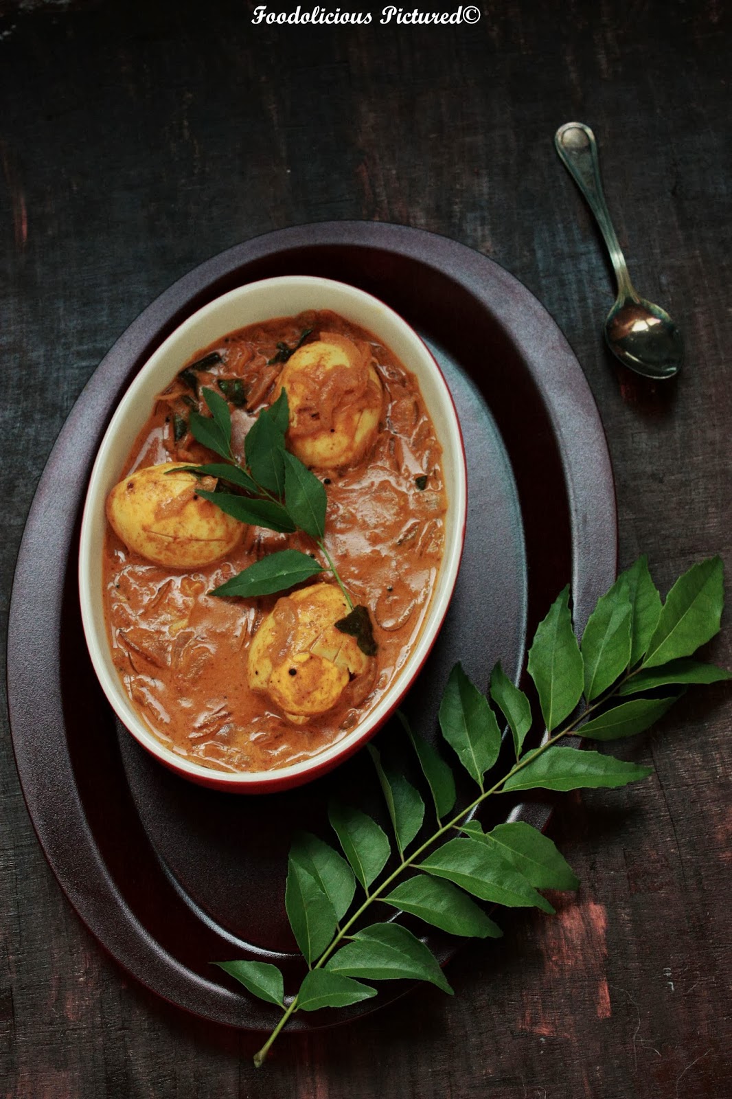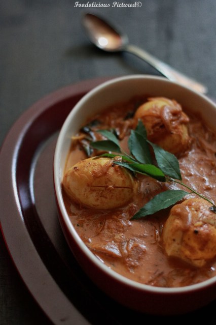 Add the coriander, chili, turmeric, fennel powders and saute till the oil start to separate. Add the 1/2 cup water, salt to taste and mix well, Add the boiled egg, remaining curry leaves, cover and cook till the gravy is thick.