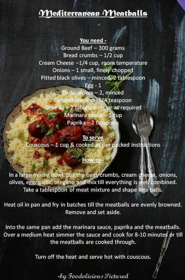 Over to the recipe, after a week of all the vegetarian meals, it was time for some meat. And this Mediterranean Meatballs is what I made for lunch today. They are so full of flavor and really easy to whip up. I have adapted the recipe from Kraft and made some changes to it. With this I have one more recipe to cook for Saana often as she simply loved it.